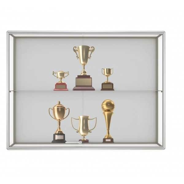 Wysokiej jakości gablota na puchary i pamiątki, wykonana z profili aluminiowych oraz przeszklenia ze szkła hartowanego. Szklana witryna przeznaczona jest do użytku wewnątrz pomieszczeń. Solidna gablota na trofea wyposażona jest w półkę z płynną regulacją wysokości, a przesuwane na prowadnicach drzwiczki zamykają się na kluczyk. Wyeksponowane laury i nagrody chronione są przed kurzem i zniszczeniem, a także przed niepowołanym dostępem. Szklana witryna spełnia normy bezpieczeństwa w budynkach użyteczności publicznej, dlatego tak chętnie wybierana jest przez urzędy, muzea, urzędy, szkoły i kluby sportowe.