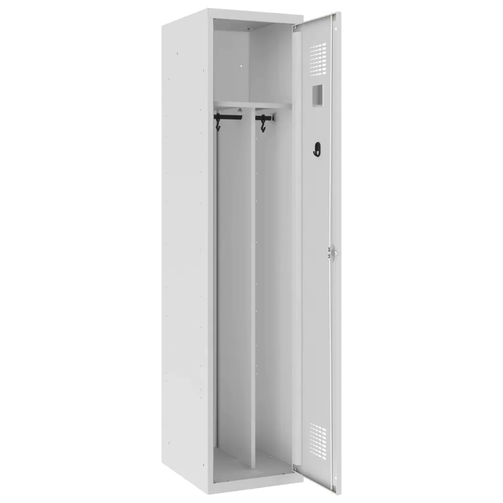 Solidna konstrukcja oraz praktyczne wyposażenie szafy pozwala na wygodne oraz w pełni bezpieczne przechowywanie w niej swoich osobistych rzeczy, odzieży oraz obuwia. Wykonany z wysokiej jakości blachy stalowej mebel wyposażony został w wewnętrzną przegrodę, pojemną półkę oraz drążki, haczyk i praktyczne lusterko. Ponadto, na drzwiach szafki wykonana została specjalna perforacja, pełniąca funkcję wentylacji.