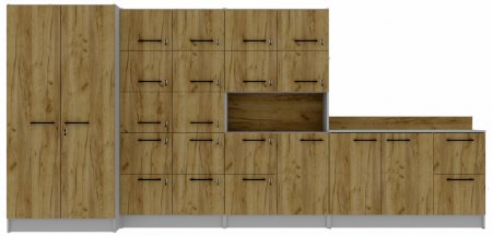 Wykonanie: Korpusy wszystkich segmentów wykonane z płyty wiórowej laminowanej 18 mm do samodzielnego montażu za pomocą kołków i śrub. Ściana tylna wykonana z płyty lakierowanej MDF. Drzwi zawieszane na zawiasach puszkowych, zamykane na zamki. We wnętrzach półki stałe lub ruchome. W segmencie trzy szuflady. Eleganckie uchwyty o długości 353 mm i 225 mm malowane proszkowo.
